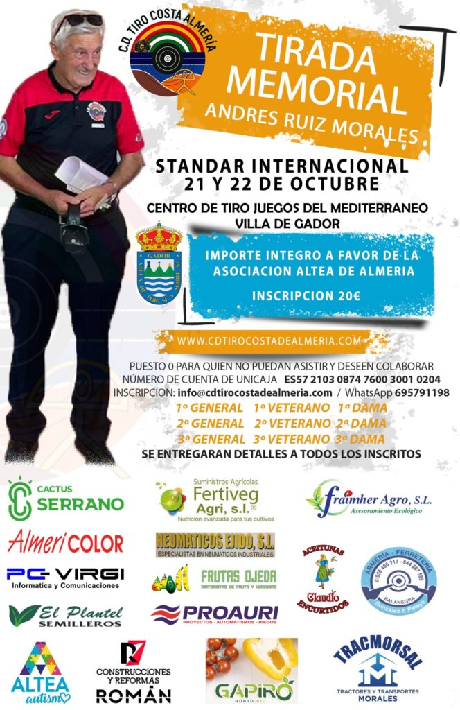 Los días Sábado 21 y Domingo 22 de Octubre del 2023, vamos a celebrar una tirada de la modalidad Standard Internacional en memoria de Andrés Ruiz Morales. El evento tendrá lugar en el centro de tiro Juegos del Mediterráneo, situado en la localidad Villa de Gádor, Almería.